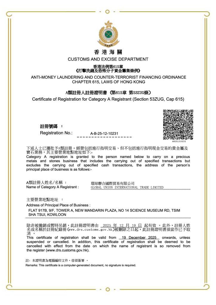 合法合规黄金、珠宝交易,拥有【A类注册的注册证明书】